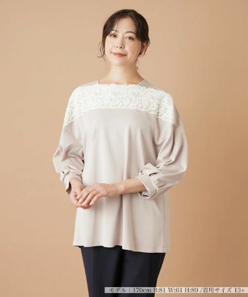 フロントのレースがロマンチックな表情を作り出すオーバーブラウス。端正なスクエアネックがデコルテを綺麗に覗かせ、大人の女性らしい上品な雰囲気に。レーヨン×ナイロンの生地にはストレッチが効いているのでアクティブな動作もスムーズに行えます。ドロップショルダーで袖にゆとりをもたせ、リラクシーな着心地を叶えました。身体のラインを拾いにくいシルエットで体型カバーもお手のものです。