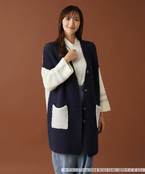 ざっくりとローゲージで編み込んだ、カラーブロックデザインのニットカーディガン。コントラストの効いた配色がインパクトを放ちます。袖にはラインをあしらい、さりげないアクセントに。シルエットはドロップショルダーでゆったりと落ち感をもたせ、リラクシーな着心地を叶えました。ヒップまで隠れるセミロング丈なので、すっきりとしたパンツを合わせた際もナチュラルに体型カバーしてくれます。フロントはスナップボタンにより開閉が可能。