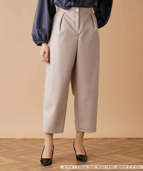 スムースな風合いが美しいフェイクレザーパンツ。フロントタックを配したゆとりのあるシルエットがリラックス感のある穿き心地。伸縮性のある素材なので動きやすく、バックウエストはゴム仕様になっているので、穿き心地も快適。プレーンなシャツやニットなどを合わせるだけでも上級者らしいお洒落感のある着こなしにアップデートしてくれるアイテム。足元をショートブーツに変えるだけで、シーズンライクなコーディネートに仕上がります。