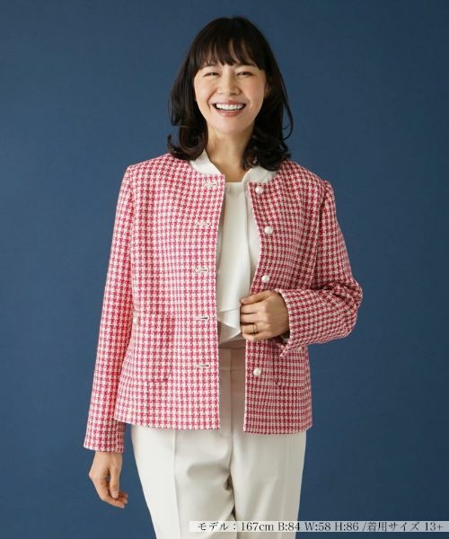 クラシカルな千鳥格子柄をビビッドカラーで表現した、ツィーディーな風合いのノーカラージャケット。前立てやポケット、袖口にトッピングした大粒のパール調ボタンがさりげなく気品を感じさせるアクセントに。やや短めの丈感となっており、様々なボトムスとバランスよくコーディネートできます。一点投入でスタイリングを新鮮な印象にアップデートしてくれるアウターです。