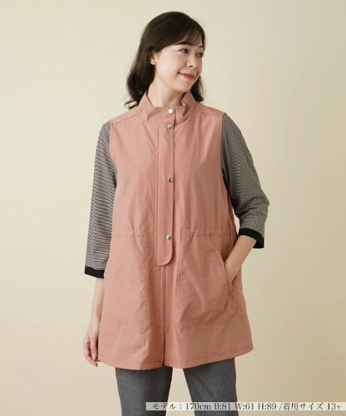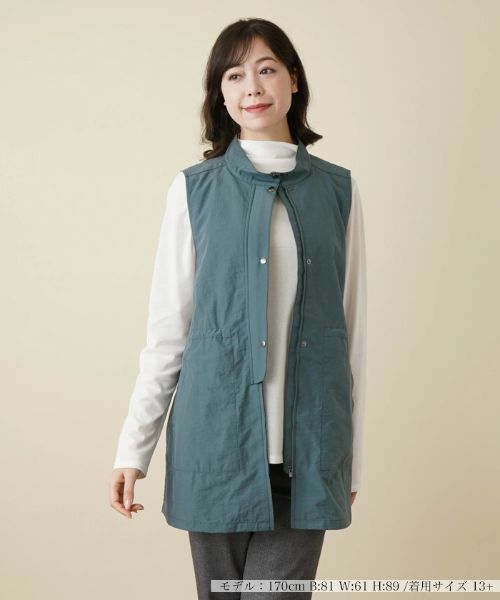 ニットやカットソーに重ねるだけで、上級者らしいレイヤードスタイルが完成するロング丈のスタンドカラーベスト。コットンにナイロンをブレンドした爽やかな風合いの生地を使用しています。フロントはスナップボタン×ファスナーのダブルクロージャー仕様。ウエスト高め位置にある裏側のドローコードにより調整が可能です。ヒップまで隠れる程度の丈感でナチュラルに体型カバーできるのも嬉しいポイント。