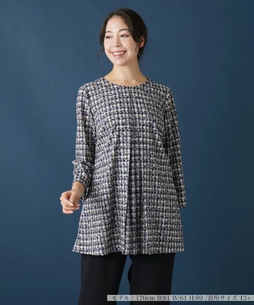 味わい深い表情を織りなすツイードライクな生地を使用したチュニックブラウス。ネックラインはすっきりと開きをもたせ、絶妙な抜け感を作り出しています。フロント中央にタックを入れ、立体的なシルエットに。ふんわりとしたクロップド丈のスリーブがこれからの季節らしい軽やかなニュアンスを感じさせます。ヒップまで隠れる程度の丈感でナチュラルに体型カバーできるのも嬉しいポイント。