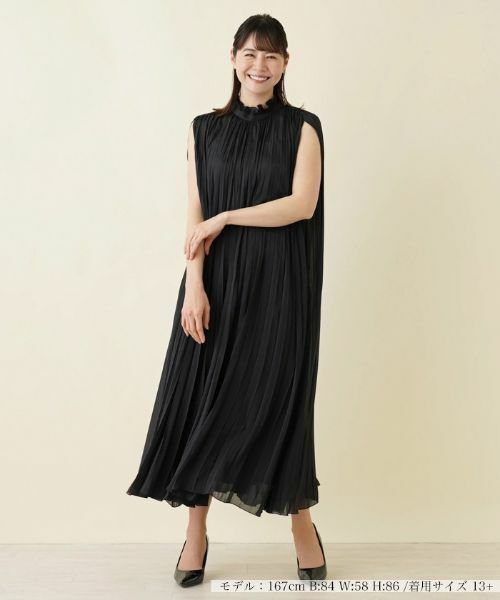 ショルダーラインを隠すようにデザインされた、美しいシルエットに魅了されるフリルカラーロングワンピース。たっぷりとギャザーを配した、上品なシルエットも魅力的な1枚。シャイニーな風合いも美しいアイテムは、オケージョンスタイルなどに最適です。アンダードレス付き。