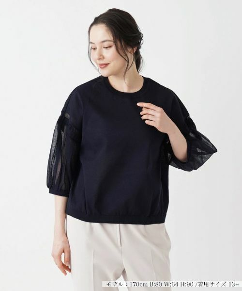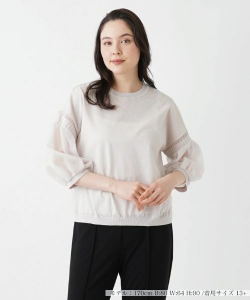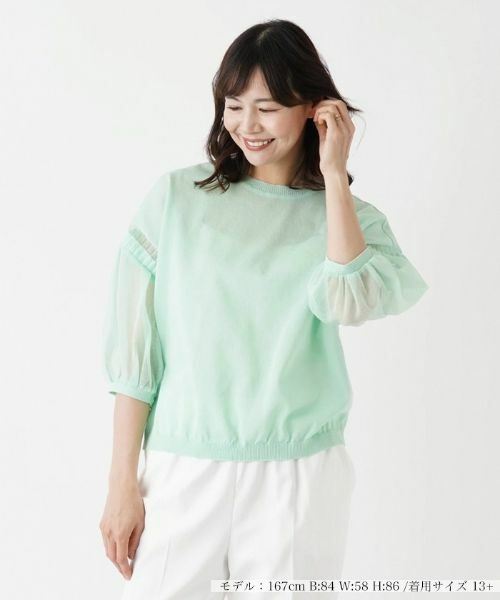 シアー素材で切り替えた、ふわりとしたボリュームスリーブがトレンドのエッセンスを添えるニットプルオーバー。軽やかなコットンベースのハイゲージニットで肌当たりがよく、優しい温もりが感じられます。統一感のある落ち着いたカラーでまとめているので着こなしやすく、リラックスしたデイリーカジュアルから大人エレガントな週末スタイルまで、幅広いコーディネートにマッチし、お洒落心をさりげなくアピールできます。