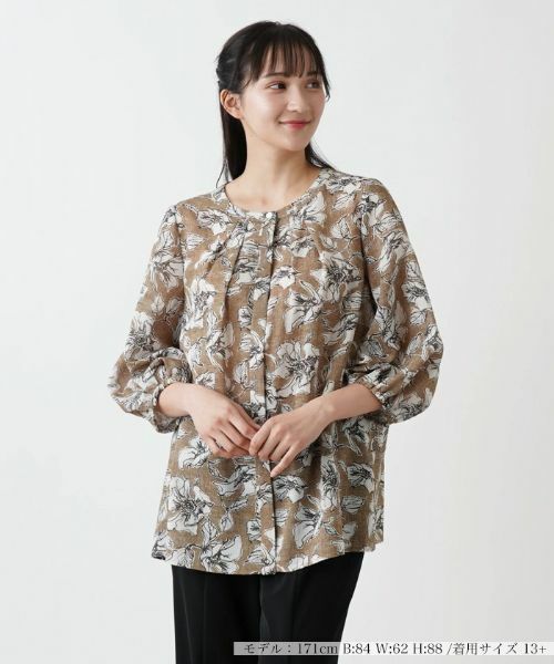 手描き風のアーティスティックなボタニカル柄をプリントしたノーカラーブラウス。ネックは適度に開き、絶妙なバランスの抜け感を演出。さらにネック周りには放射状にタックが施され、ふんわりとしたクロップドスリーブとともに立体的なシルエットを構築しています。ボタンを隠した比翼フロントですっきりとした印象に仕上げられており、袖口はゴム仕様とし心地よいフィット感をもたせました。ボトムスを選ばずにコーディネートしやすく、着回し力に優れたアイテムです。