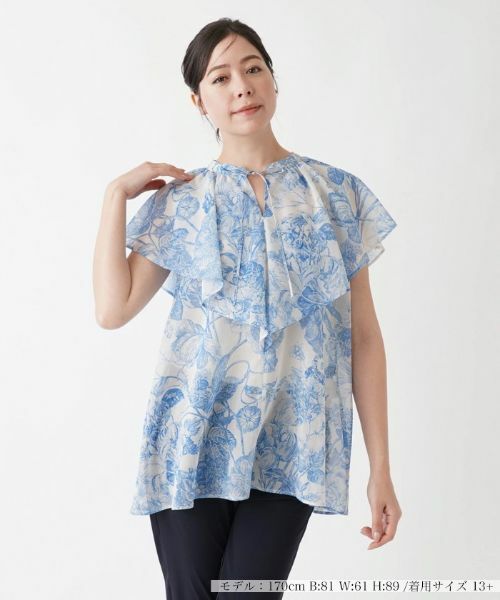 絵画を思わせる繊細なタッチのボタニカル柄をプリントしたブラウス。透け感のある素材を用い、ふわりとしたエアリーなシルエットで軽やかにデザインしました。シャープなキーネックが絶妙なバランスの抜け感を作り出し、ボリュームのあるケープ風のサークルフリルが大人のエレガンスを感じさせます。ヒップまで隠れる程度の丈感でナチュラルに体型カバーできるのも嬉しいポイント。パンツ、スカートを選ばずにコーディネートしやすく、着回し力にも優れたアイテムです。