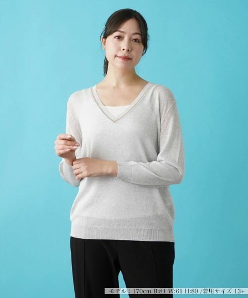 ラメの輝きをちりばめたラグジュアリーな雰囲気のVネックニット。レーヨンやナイロンをブレンドしてハイゲージで編み込んだ、ニットの優しい温もりが感じられる一枚。ゆったりと開きをもたせたVネックが絶妙な抜け感を演出。シルエットには程よくゆとりをもたせ、リラクシーな着心地を叶えました。ベーシックなパンツですっきりとまとめたり、フェミニンなスカートでエレガントに仕上げたりと、様々な着こなしが楽しめます。