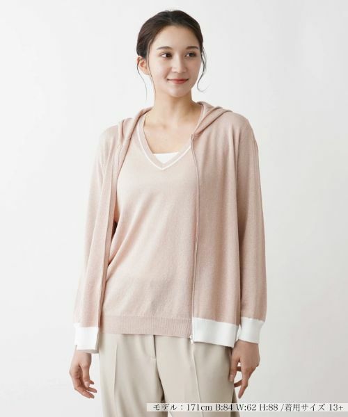 ラメの輝きをちりばめたラグジュアリーな雰囲気のニットパーカ。レーヨンやナイロンをブレンドしてハイゲージで編み込んだ、ニットの優しい温もりが感じられる一枚。袖口や裾は配色で切り替え、バイカラーのコンビネーションが光るデザインに。フロントはファスナーによりスムーズに着脱が可能。バックは大ぶりのフードがインパクトを放ち、こなれ感のあるスタイルを演出。大人スポーティな旬のコーディネートを手軽に楽しめます。