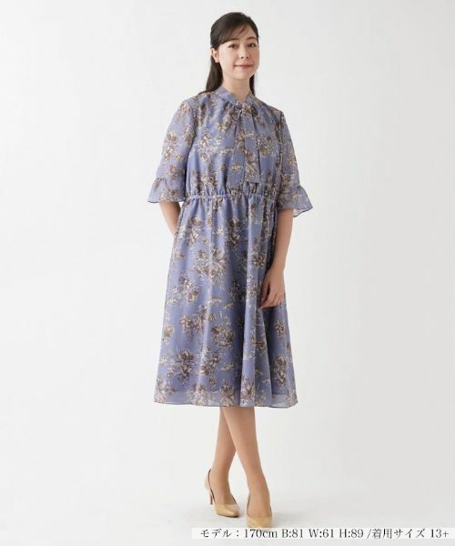 薄手のシアー素材に繊細なタッチのフラワー柄のプリントが広がるミモレ丈ワンピース。首元で結ぶボウタイがほんのりと上品かつノーブルな雰囲気を演出。ハイウエストでゴムを通してフィットさせ、スカート部分はふわりと広がる美しいフレアシルエットでデザインしています。控えめながらも洗練された華やかさがあり、これからの季節の様々なシーンでコーディネートを大人レディな表情にアップデートしてくれる一枚です。フロントはコンシールファスナーにより開閉が可能。
