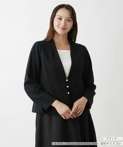 無駄な装飾を省いたベーシックなデザインのノーカラージャケット。シャープなVゾーンが絶妙なバランスの抜け感を演出。フロントはパール調ビジューのボタンにより開閉が行え、スリット入りの袖口は折り返してのアレンジも可能。やや厚手の生地にはストレッチ性があるので心地よくフィットし、身のこなしもスムーズ。定番のパンツルックはもちろん、フェミニンなスカートとも合わせやすく、オフィスカジュアルから週末のお出かけまで多彩なシーンで活躍してくれそうなアイテムです。
