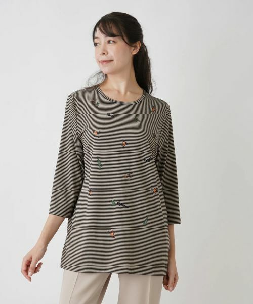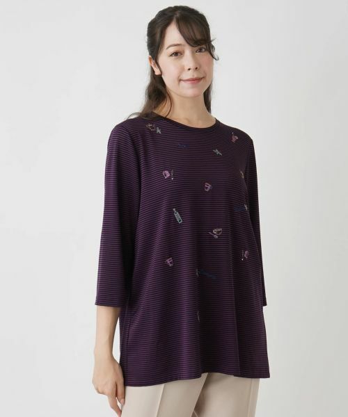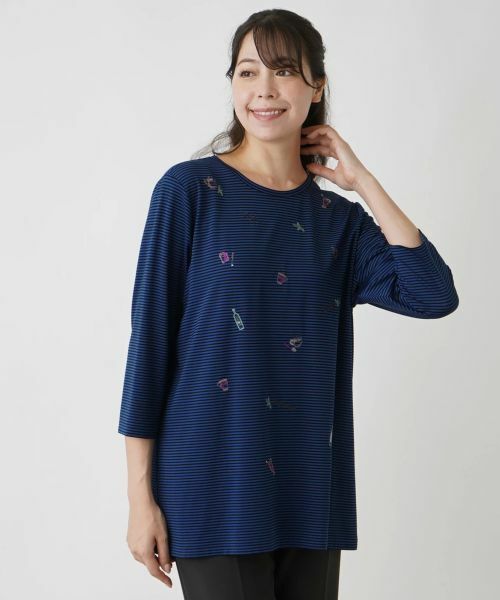 シンプルなナローボーダーを背景に、ユニークな刺繍を施した遊び心溢れるデザインのプルオーバー。スパンコールの煌めきがさりげないアクセントになり、ひと味違った表情を作り出しています。ネックラインはすっきりと開きをもたせ、ヘルシーなデコルテ見せを演出。クロップドスリーブで軽快な印象に仕上げ、ジャストシーズンのカジュアルなスタイリングを後押しします。定番のパンツルックはもちろん、フェミニンなスカートともマッチする着回し力に優れたアイテムです。