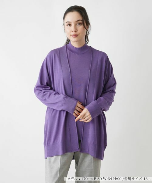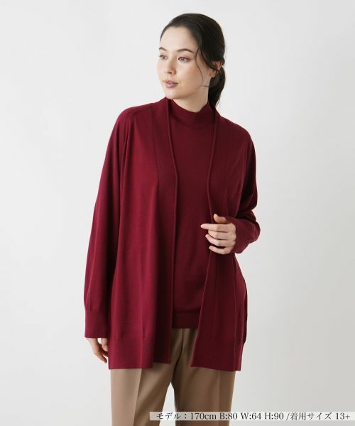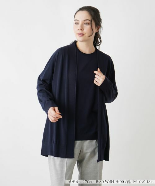 ハイゲージで丁寧に編み込まれた、やや薄手のノーボタンニットカーディガン。ラグランスリーブでゆとりをもたせ、すっきりとした印象でありながら、程よいリラックス感が感じられるシルエットを作り出しています。ヒップまで自然と隠れる程度のセミロング丈でさりげなく体型カバーできるのも嬉しいポイント。シンプルなデザインでさまざまなアイテムとコーディネートしやすく、同素材のインナーとの重ね着もおすすめです。