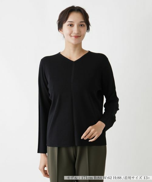 着回し力の高いシンプルな無地のVネックニットプルオーバー。すっきりとした浅めのネックラインがデコルテを美しく上品に引き立てます。フロント中央や袖には編地の切り替えによりラインを描き出し、スタイリッシュなアクセントに。レーヨンにポリエステルをブレンドして編み込んだ、柔らかなニットの温もりが感じられる一枚。デイリーからオフィスカジュアル、週末のお出かけまで多彩なシーンで活躍してくれそうです。