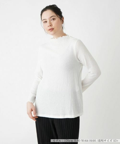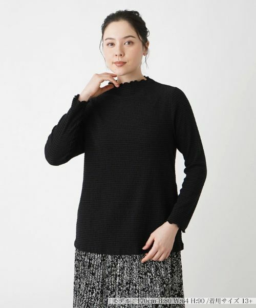 くしゅっとした素材が柔らかな表情を醸し出すボトルネックブラウス。ネックラインや袖口にはメロウフリルをあしらい、ほんのり甘いエッセンスをプラスしました。やや薄手の生地にはストレッチ性があり、すっきりと見えるシルエットでありながら着心地も抜群です。シンプルなカラーリングでさまざまなボトムスと相性がよく、着回し力に優れた一枚です。カジュアルからオフィススタイルまで幅広く活躍し、毎日のコーディネートに取り入れやすいアイテムです。