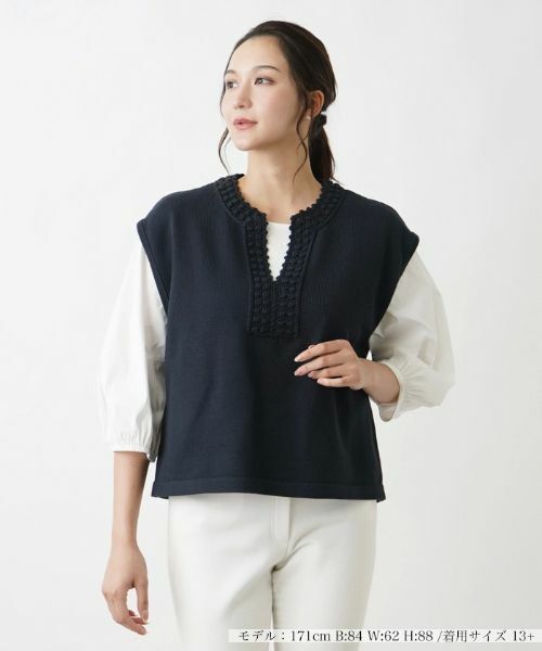 シーズンらしい抜け感を引き立てる、キーネックのニットベスト。胸元にはレースのようにも見える繊細なニッティングを施し、シンプルなカラーリングで甘さを控えめに仕上げています。肩が見えすぎない絶妙なシルエットで上品な印象を保ちながらも、程よいカジュアル感を演出。素材の質感とディテールの美しさが際立ち、インナーとの組み合わせ次第で多彩なスタイリングが楽しめそうです。デイリーからオフィスまで幅広いシーンでフレキシブルに活躍するアイテムです。