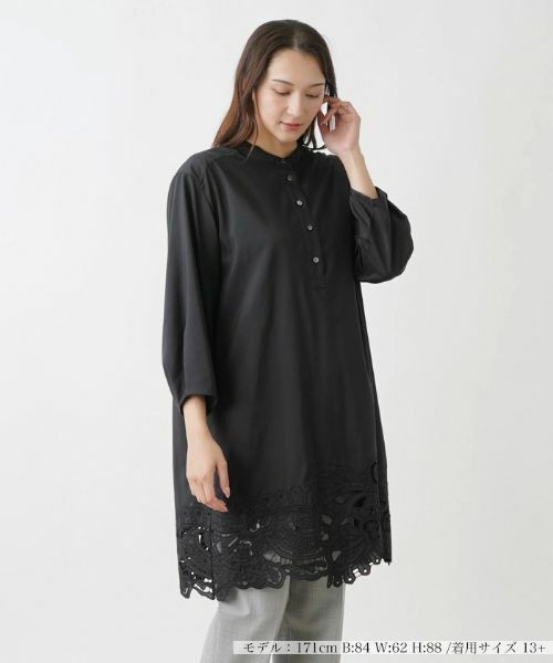 ロマンチックな雰囲気のカットワーク刺繍を取り入れた、軽やかなクロップドスリーブのチュニックブラウス。襟はバンドカラーですっきりとした印象にまとめています。さらりとした風合いのやや薄手のポリエステル素材を使い、シルエットに程よくゆとりをもたせることで、肩肘張らないリラクシーな着心地を叶えました。シンプルな色合いで様々なボトムスとコーディネートしやすく、着回し力に優れたトップスです。