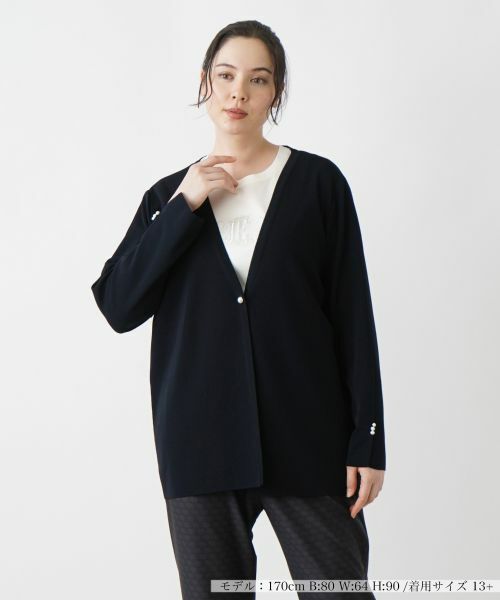 さらりとした質感のニットカーディガン。光沢があり,なめらかな肌触りで上品に着こなせます。前立てと袖口のパール釦がデザインアクセントに。ヒップが隠れるミドル丈なので、スカート、パンツどちらも合わせやすいデザインとなっております。