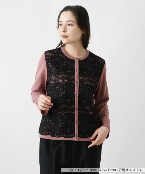 フロント部分に繊細なレースをあしらった、ショート丈のクルーネックカーディガン。ハイゲージで編み込んだニットの優しい温もりが感じられる一枚。すっきりとしたシルエットでボディラインを美しく引き立てながら、コーディネートで存在感を放ち、幅広いボトムスとの相性も抜群。パンツやスカートなど、どんなスタイルにもバランスよく取り入れられる一枚です。フロントでほんのりと光沢を放つ貝調ボタンがさりげないアクセントに。