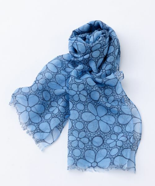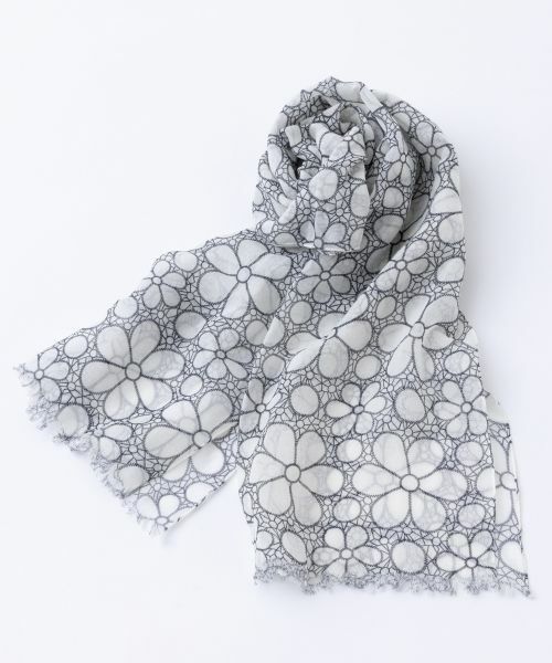 さらりとした質感のコットン系と麻を思わせるさらりとした風合いの繊維の生地に、涼やかで上品なレース調の花柄をプリントしたストールです。首周りの日焼け対策や、夏の冷房対策などにご利用いただけます。家庭洗濯不可漂白不可タンブル乾燥不可アイロン低温210℃までドライクリーニング可ウェットクリーニング不可
