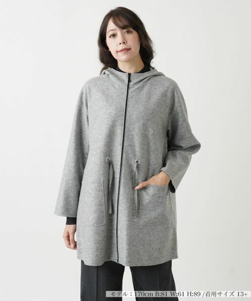 首元までしっかりと覆うハイネックタイプのフーデッドコート。起毛感のある生地が肌寒い季節に優しい温もりを生み出す、包み込まれるような着心地が魅力の一着です。ドロップショルダーでゆったりとしたリラックス感のあるシルエットを演出。動きやすさと快適さを両立させながら、こなれた雰囲気を漂わせます。フロントはファスナー仕様で、スムーズに着脱が可能。ヒップまで隠れる丈感がさりげなく体型をカバーしてくれるのも嬉しいポイント。ハイウエスト位置にはラメ入りのドローコードをあしらい、スタイルに合わせてシルエットの調整が行えます。