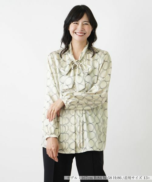 手描き風のユニークな柄を落とし込んだボウタイブラウス。フロントにはピンタックを施し、さりげなくエレガントなエッセンスをプラスしました。さらりとした風合いのやや薄手のファブリックを使用しており、ふんわりと膨らむボリュームスリーブがリラクシーな着心地を実現します。定番のベーシックなパンツでまとめるのはもちろん、フェミニンなスカートとも好相性。