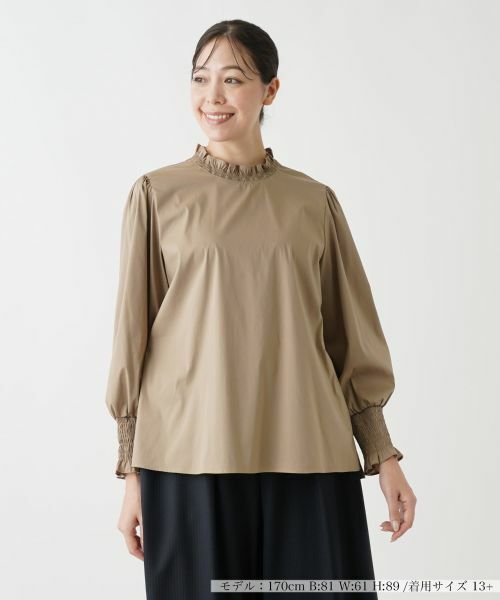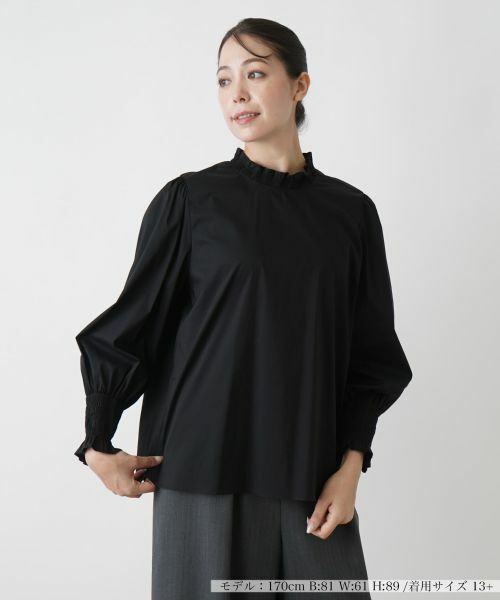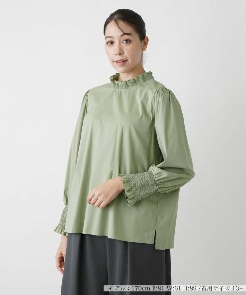 襟ぐりや袖口のフリル&シャーリングがほんのり甘いエッセンスを漂わせるハイネックブラウス。コットン×ナイロンのさらりとした風合いの生地にストレッチ素材を混紡しているので着心地も快適。前裾にはサイドスリットを入れ、着こなしやすさにも配慮しています。バックネックの涙あきのボタンにより開閉が可能。シンプルなカラーリングでボトムスを選ばずにコーディネートしやすく、着回し力にも優れています。