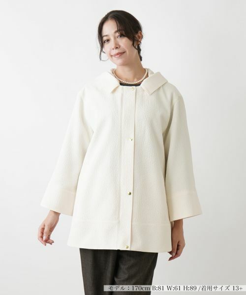 凹凸のある独特な表面感のファブリックで仕上げた、ビッグフード付きのジャケット。フードは取り外しでき、2wayでの着こなしが楽しめます。ゆったりとしたリラックスシルエットでストレスフリーの着心地を実感できます。身体のラインを拾いにくく、ヒップまで隠れる程度の丈感でナチュラルに体型カバーできるのも嬉しいポイント。フロントはスナップボタン?ファスナーのダブルクロージャー仕様でしっかりと閉じられるので安心です。