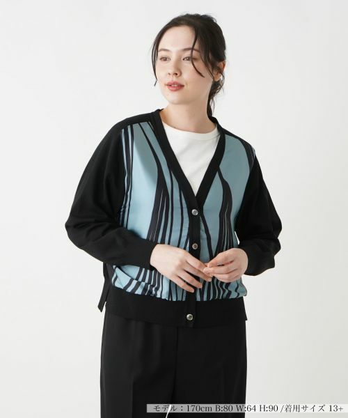 ブルーグレーを基調とした前面の柄が目を引き、全体にモダンで洗練された印象を与えるフロントに大胆なストライプ柄がデザインされたカーディガンです。
