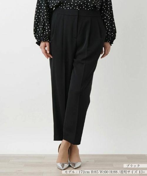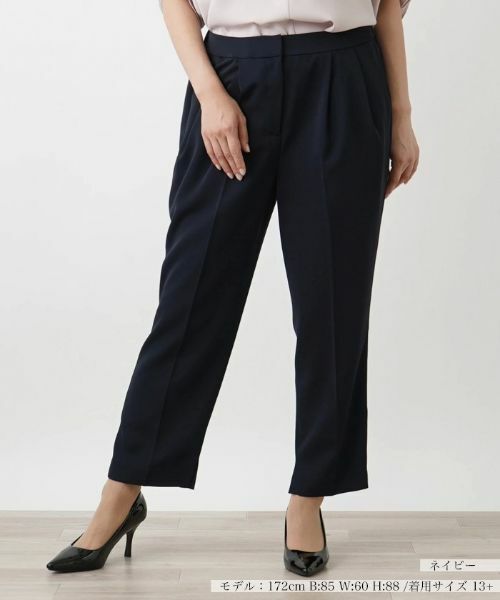 綺麗なセンタープレスの9分丈テーパードパンツ。程よくルーズで、腰回りのラインを拾わず、リラクシーな履き心地も嬉しいポイントです。裾の内側には小さめのスリットが入っていて、足元にいつもと違うワンポイントを。足首の華奢さが際立ち、ヒールやパンプスがより一層綺麗見えします。【サイズ表記について】