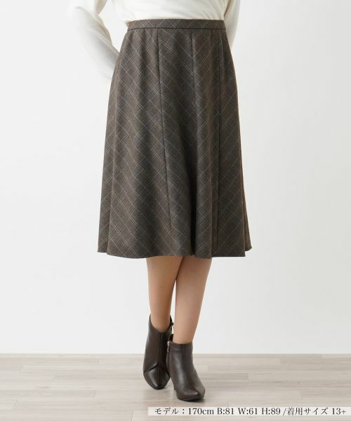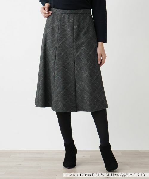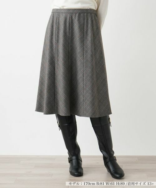 クラシカルなグレンチェック柄をバイアスに描いた、ミディアム丈のフレアスカート。ウエストラインをさりげなくシェイプしつつ、裾に向かってふんわりと広がる立体的なシルエットが、大人フェミニンなムードを演出。ハイウエストでのデザインが特徴で、トップスをタックインして着こなせば脚長効果が期待できるスタイリングも楽しめます。エレガントさと動きやすさを兼ね備えた一枚は、デイリーからオフィスカジュアルまで幅広く活躍しそうです。