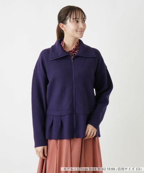 ふわりと広がる裾周りのフリルが、ほんのりとフェミニンな華やかさを演出するペプラムジャケット。ボリューム感たっぷりの襟が存在感を放ち、小顔効果を発揮。ドロップショルダーでゆとりをもたせ、リラクシーなシルエットを作り出しています。フロントはジップアップにより着脱がスムーズに行えます。落ち着いた色合いでまとめているのでインナーやボトムスとも合わせやすく、着回し力に優れたアウターです。