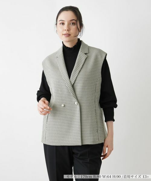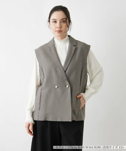 トラディショナルな千鳥格子柄が目を引くダブルブレストデザインが大人ハンサムなベスト。きちんと感のあるデザインながらも、ノースリーブ仕様で軽やかさをプラスしています。前面のパール調ボタンが上品なアクセントとなり、シンプルなコーディネートにも映えるアイテムです。ブラウスやニットとのレイヤードスタイルで、ノーブルな印象に着こなせるのも魅力。オンオフ問わず、様々なシーンで活躍する一枚です。