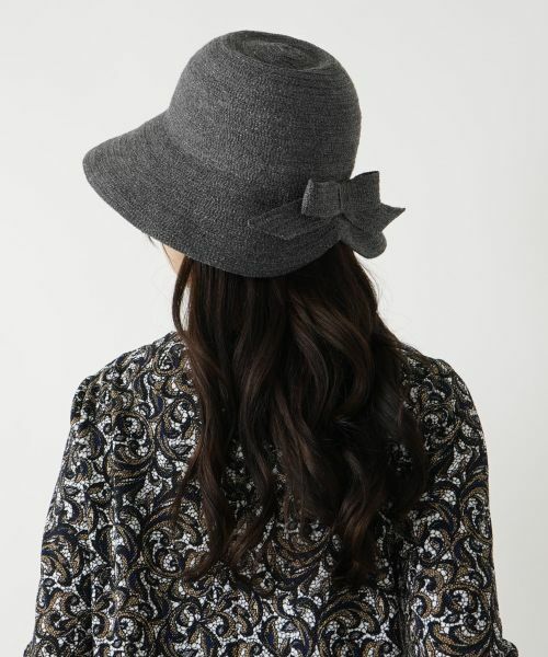 後部には大きめのリボンがついており、フェミニンなアクセントが魅力のハットです。帽子の形はつば広のクロシェタイプで、つばが顔周りを柔らかく覆い、日差しを遮りながらもスタイリッシュな印象を与えます。このデザインはカジュアルにもエレガントにも合わせやすく、秋冬の季節に特に活躍しそうです。家庭洗濯不可漂白不可タンブル乾燥不可アイロン不可ドライクリーニング不可ウェットクリーニング不可