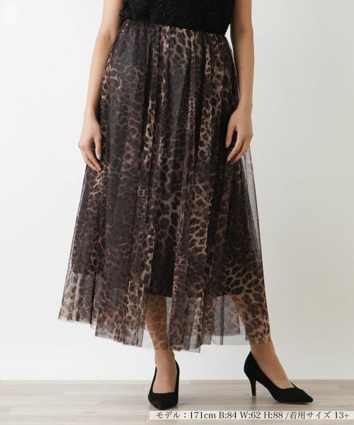 レオパード柄がベースに施され、上に重ねられたチュールが柔らかさを加え、モードな雰囲気とフェミニンさを兼ね備えています。ウエストはゴム仕様で履き心地が良く、リラックスして着用可能です。カジュアルなトップスと合わせてもおしゃれで、華やかなシーンにもぴったり。個性的なコーディネートを楽しみたい方におすすめのアイテムです。【サイズ表記について】
