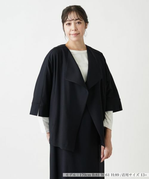 柔らかく上品な印象を与えるゆったりとしたシルエットのジャケットです。フロント部分は大きく開いた襟が特徴で、レイヤードスタイルに適しており、ボリューム感のある袖口にはスリットが入っています。カジュアルにもフォーマルにも合わせやすく、動きやすいデザインが魅力的です。家庭洗濯不可漂白不可タンブル乾燥不可アイロン低温160℃まで石油系溶剤ドライクリーニング弱ウェットクリーニング不可
