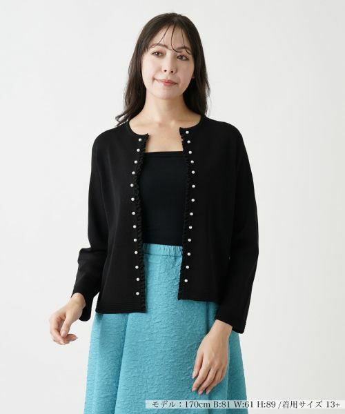 パール調ビジューと繊細なフリルが、華やかでデコラティブな雰囲気を引き立てるクルーネックカーディガン。ドロップショルダーのデザインは、程よいリラックス感を演出し、ストレスフリーな着心地を実現。襟元にはホック留めを採用しており、きちんと感を残しながらも、さっと羽織るだけでスタイリッシュに仕上がる一着です。やや短めの丈感なので、ワンピースやロングスカートとの相性も抜群で、女性らしいエレガントなコーディネートが完成します。