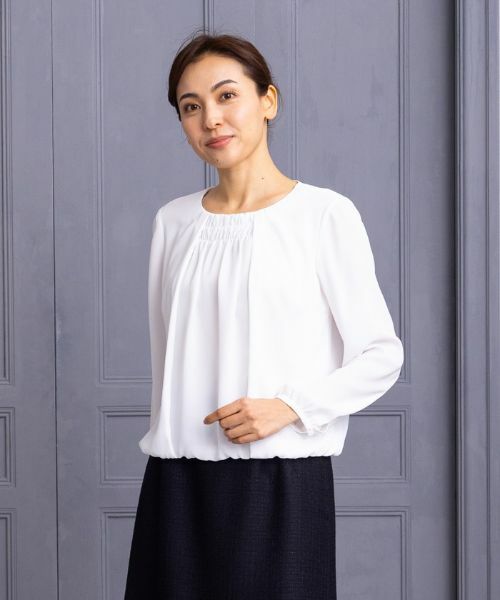 胸元にゴムシャーリングを入れて動きを出したデザインのスーツインブラウス。裾はゴム入りなので着るだけでボトムにインしたような着こなしに。スカートにスタイルにはピッタリの丈バランスです。------------------------------------着用シーズン:初夏伸縮性:なし透け感:ありポケット:なし生地の厚さ:薄手お取扱い方法:ウォッシャブル(手洗い可)裏地:あり-------------------------------------※商品の色味は、撮影場所や光のあたり具合、お客様のお使いの機器により色味が違って見える場合がございます。予めご了承ください。手洗い可酸素系漂白可タンブル乾燥不可つり干し(日陰)アイロン低温120℃までドライクリーニング可ウェットクリーニング(弱い処理)