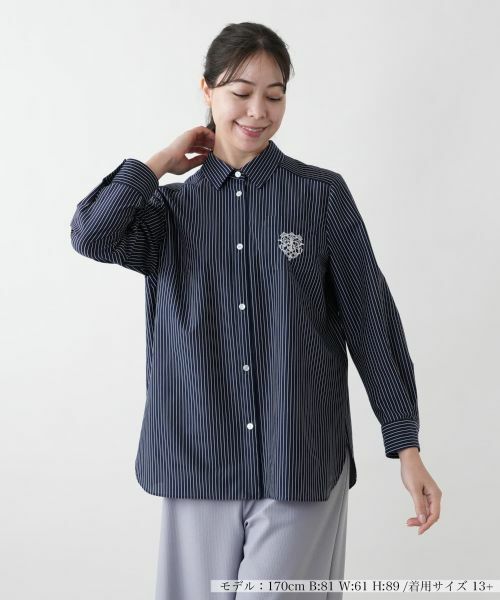 ナローストライプが洗練された爽やかさを感じさせるシャツ。コットンにポリエステルをブレンドした、さらりとした風合いの生地を使用し、快適な着心地に仕上げました。左胸のポケットにはエンブレム刺繍を施し、存在感のあるアクセントをプラス。裾はラウンドカットヘムで絶妙なバランスの抜け感を作り出しています。パンツにもスカートにも合わせやすく、オンオフのシーンを選ばずに活躍する一枚です。