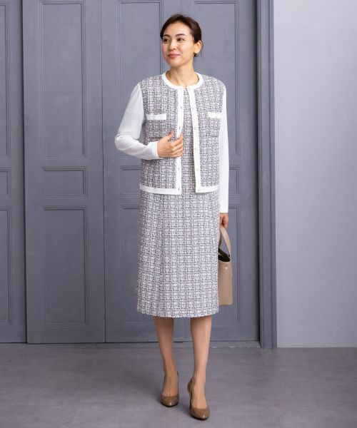 春らしい配色のツイード素材を前身頃に使用したニットのドッキングカーディガン。ニットは清潔感のある白を合わせているので上品で優しい印象に。同素材のワンピースを合わせるのもおすすめです。また無地のスカートやパンツはもちろん、デニムなどに合わせて普段使いにも着回しできるデザインです。