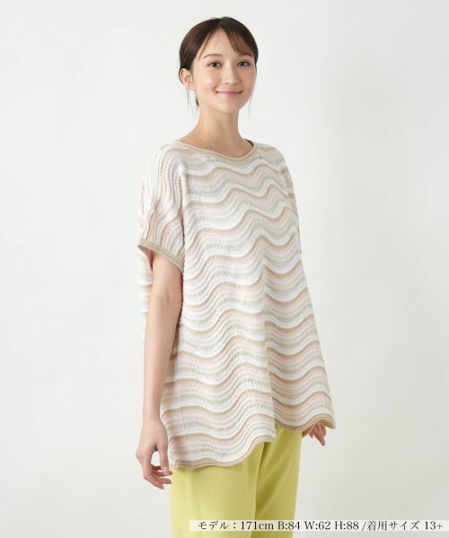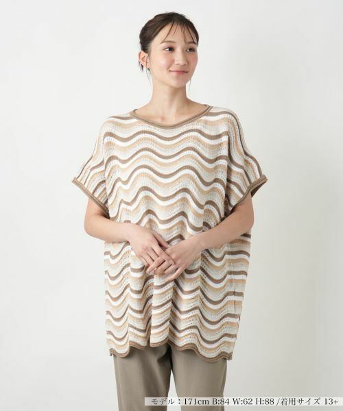 ラメが煌めくウェーブボーダーが視覚的なインパクトを放つニットベスト。ネックラインはすっきりと開き、絶妙なバランスの抜け感を演出。程よくゆとりをもたせたリラクシーなシルエットが、こなれた大人の雰囲気を引き立てます。透かし編みの軽やかな風合いが心地よく、涼やかに着こなせる一枚。シンプルなインナーと合わせてレイヤードを楽しんだり、ワイドパンツやロングスカートでまとめてモードライクに仕上げたりと、幅広いスタイルにマッチします。