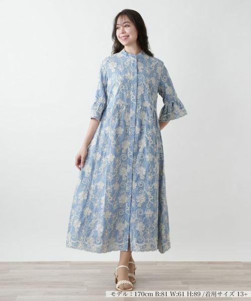 ボタニカル模様のカットワーク刺繍が、季節感溢れる華やぎを添えるフレアワンピース。さらりとした風合いのコットン生地を使用し、軽やかかつ快適な着心地に仕上げました。端正なバンドカラーが顔周りを品よく引き立て、ふわりと広がる存在感たっぷりのシルエットで大人エレガントな佇まいを演出。肌寒い日はジャケットを重ねてシックに、暖かい日は前を開けてアウターライクに羽織るなど、アレンジ次第で幅広いスタイリングが楽しめます。