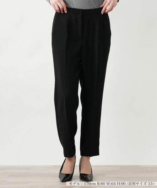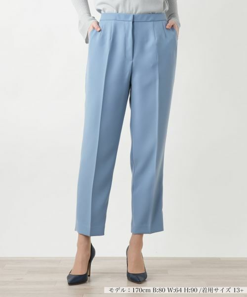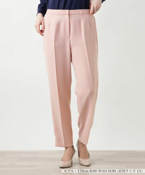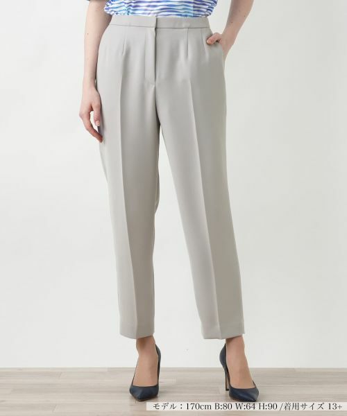 様々なスタイリングに取り入れやすく、オンオフ問わず活躍する上品なカラーリングのテーパードパンツ。腿周りに程よくゆとりを持たせつつ、裾に向かって緩やかに絞り込まれたシルエットが絶妙。フロントにセンタープレス、バックにセンターシームを施すことで縦ラインを強調し、すっきりとした美脚見せ効果を演出します。やや薄手の生地を使用し、軽やかなはき心地を実現しました。程よくストレッチを効かせているので、動きやすさとスムーズな足捌きが感じられます。