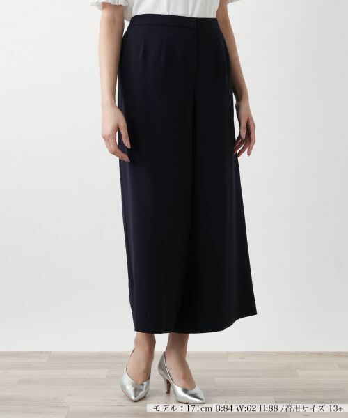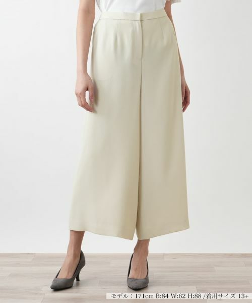 やや薄手のさらりとした生地を使用した、リラックスシルエットのワイドパンツ。ゆったりとしたフォルムが程よい抜け感を演出しながらも、洗練された佇まいをキープ。バックウエストはゴム仕様になっており、快適なフィット感を叶えつつ、動きやすさにも配慮しています。タックインすれば、ウエスト位置が高く見え、脚長見せ効果も期待できるのが嬉しいポイント。ファスナー×ホック、スナップボタンにより開閉が可能。同素材のジャケットを合わせたセットアップコーディネートもおすすめです。