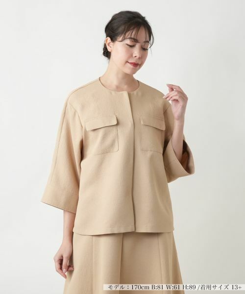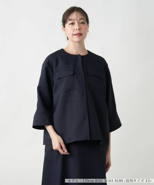 中空糸と呼ばれる筒状の形状をした糸を使用したノーカラージャケット。糸の中心部が空洞になっているため、見た目よりも軽くソフトな風合いぬ仕上がってします。さらにもみ加工を加えナチュラルな風合いを表現しています。胸元のパッチポケットがデザインポイントです。七分袖なので初夏までお召しいただけます。初秋の羽織りジャケットとしてもおすすめ。