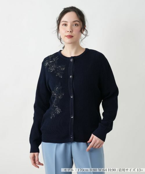 スパンコールが煌めくレース使いのフラワーモチーフをあしらい、華やかさとリュクス感を兼ね備えたカーディガン。全体にリブ編みを施し、縦ラインを強調することで、すっきりとしたシルエットを演出。程よいフィット感がありながらも窮屈さを感じさせず、快適な着心地を叶えます。ネックラインは浅めにデザインし、落ち着いた上品な佇まいに仕上げました。シックなカラーでボトムスとも相性がよく、オンオフ問わず活躍する着回し力に優れた一枚です。