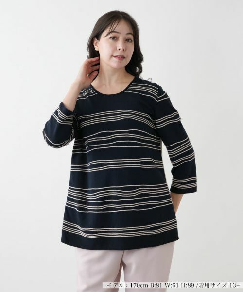 フロント&バックで切り替えた、異素材使いのニットプルオーバー。フロントはモダンなボーダー、バックはレトロ調のストライプに切り替え、視線を惹きつける遊び心のあるデザインに仕上げました。すっきりと開いたネックラインが絶妙な抜け感を生み出し、首元を美しく演出。さらにクロップドスリーブで季節らしい軽やかさもプラス。程よくゆとりをもたせたシルエットで着こなしやすく、パンツやスカートとも好バランスのひと味違ったコーディネートが楽しめます。