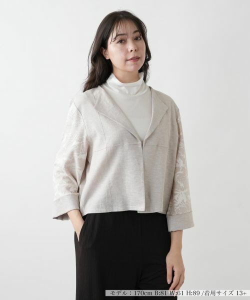 スリーブ部分に手の込んだ柄をあしらい、巧妙にアクセントを加えたショート丈のテーラードジャケット。端正なフォルムのラペルが品のある佇まいを後押しします。フロント部分は鍵ホック留めでミニマルな仕上がりに。ボディラインをすっきりと見せる計算されたシルエットで、パンツと合わせればシャープに、ワンピースやフレアスカートでまとめればエレガントな装いも仕上がり、シーンを選ばずに幅広く活躍する一着です。