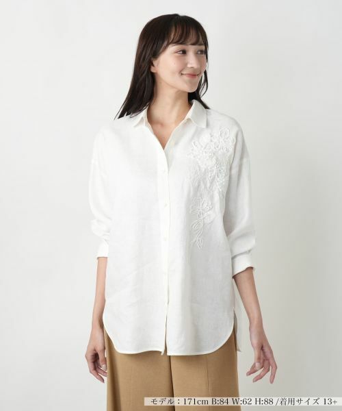 繊細なフラワーモチーフの刺繍が、さりげない華やかさを添える襟付きブラウス。表情に奥行きをもたらすトーン・オン・トーンのデザインが、上品な印象へと導きます。さらりと軽やかな麻素材で、春夏シーズンの陽気に心地よく寄り添う肌ざわりの一枚。ドロップショルダーで肩のラインを優しく包み、ラウンドヘムで動きにニュアンスをプラス。一枚着でも羽織りとしても活躍し、コーディネートに洗練された抜け感をもたらします。