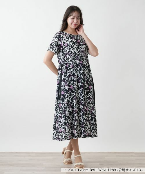 手描き風のハートモチーフを大胆にプリントした、遊び心溢れるデザインのフレアワンピース。動くたびに揺れるシルエットがフェミニンな魅力を引き立てます。ハイウエストでドローコードによりフィット感を自在に調整できる仕様となっており、スタイルアップ見せ効果も期待できます。前ウエストの両サイドには小ぶりなポケットをさりげなく配し、実用性もプラス。一枚でさらりと着こなすのはもちろん、羽織りを合わせたレイヤードスタイルもおすすめです。