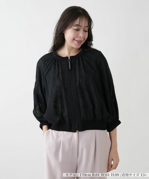 シアー素材が軽やかで女性らしさを演出してくれるジップアップブルゾン。ほんのり透け感のある素材がふわりとエアリーなシルエットを生み出し、ラグランスリーブが肩ラインを優しく包み込みます。フロントはファスナー仕様でスムーズに開閉でき、袖口はゴム仕様で心地よくフィット。羽織るだけでこなれたムードを演出できる、大人のリラックスカジュアルにぴったりの一枚です。
